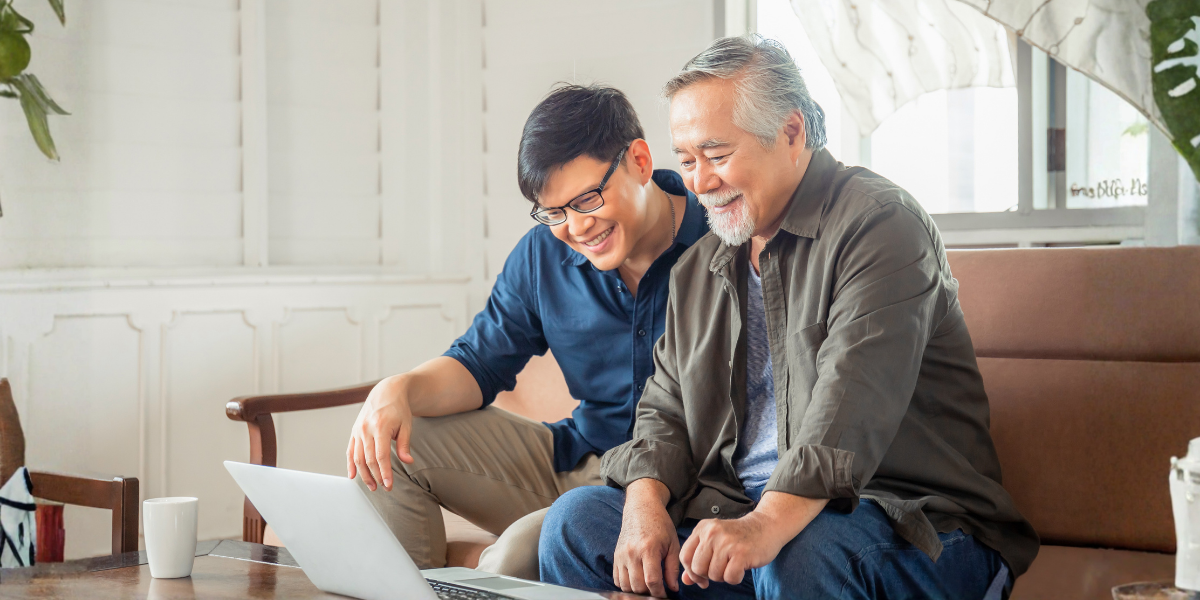 A man and woman looking at a tablet together